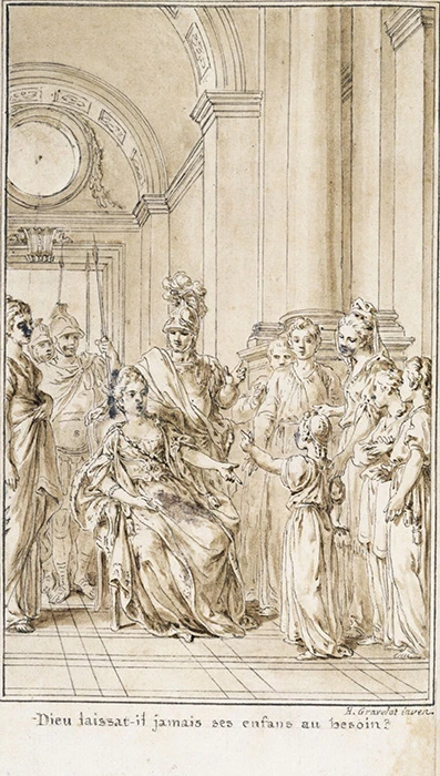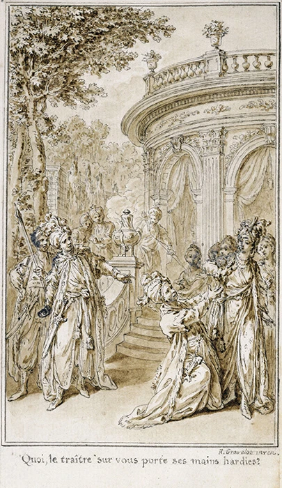 L’arrivée des premiers dessins de Gravelot coïncide avec la constitution des premières collections publiques. Les compositions de La Nouvelle Héloïse entrèrent dans les collections nationales dès la Révolution. Cette version du fameux roman épistolaire est une des copies calligraphiées par Jean-Jacques Rousseau. Le manuscrit avait été offert par l’auteur pour remercier ses bienfaiteurs, les maréchaux de Luxembourg [7]. Pour le distinguer des autres copies, il y joignit les dessins que Gravelot créa pour les estampes. Les exigences exacerbées de Rousseau permirent de conserver de nombreuses traces pour documenter son élaboration [8]. Saisis en 1794 chez une proche de la maréchale, les six volumes contenant les douze dessins furent versés en 1799 à la bibliothèque de l’Assemblée nationale [9].