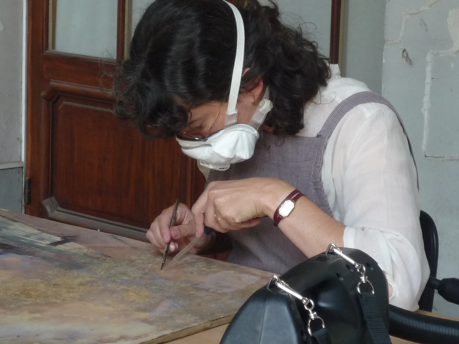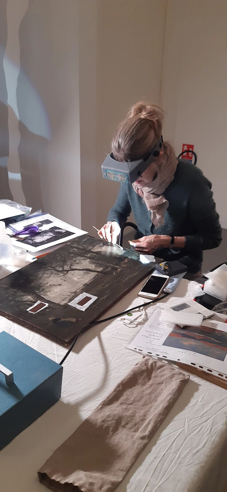 Exemple de soulèvement de la couche picturale et refixages ponctuels sur une œuvre de Corot par la restauratrice Anne Baxter lors de l’exposition En route vers l’impressionnisme au musée de Lodève © Anne Baxter et Catherine Arnold, 2023