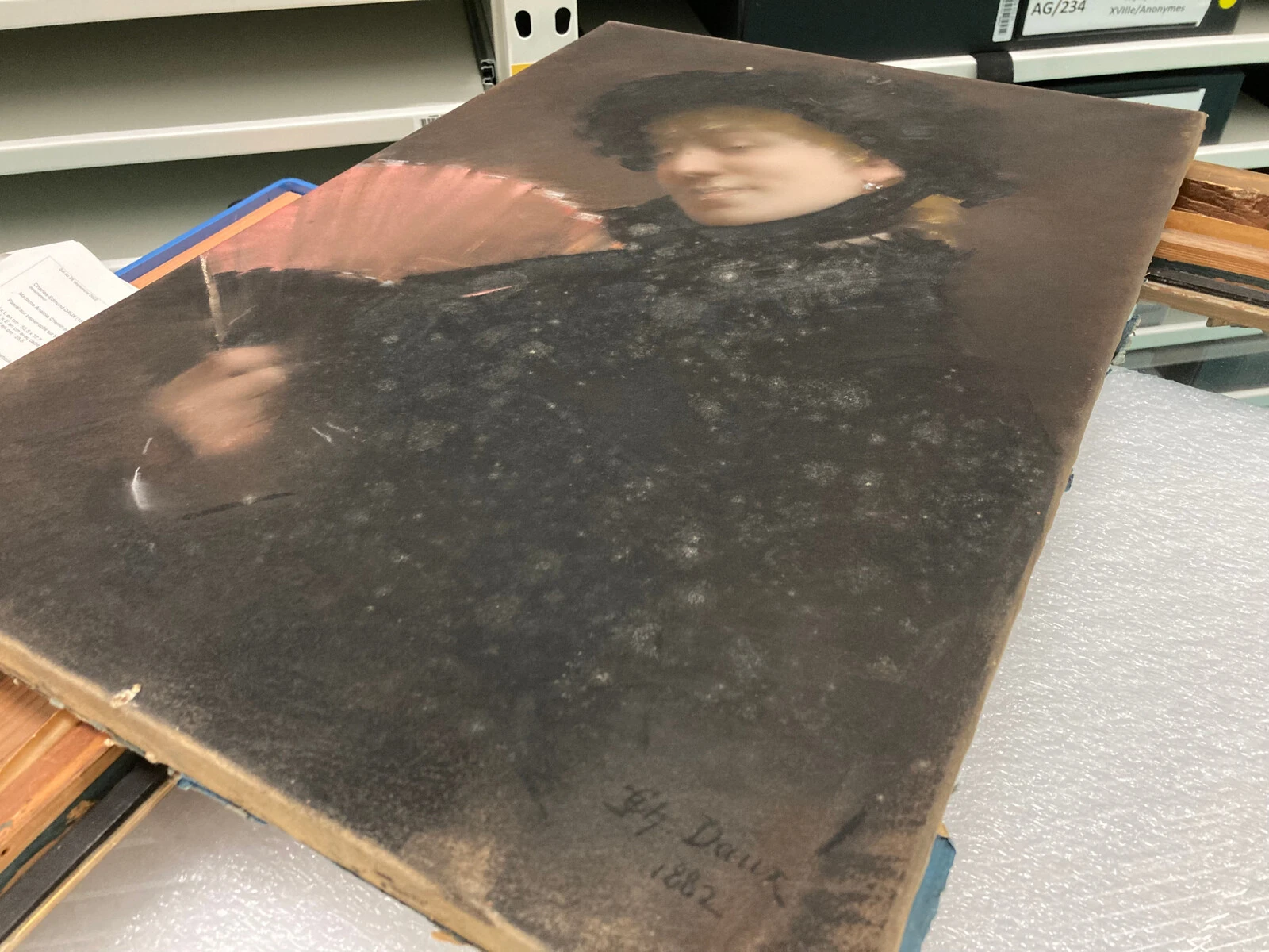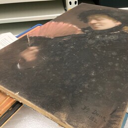 Prélèvements des moisissures pour analyse avant traitement sur une œuvre graphique par la restauratrice Nadège Dauga (© Archives Ville de Reims 2010) et exemples de moisissures sur un pastel (© Gabrielle Vergnoux, 2023)