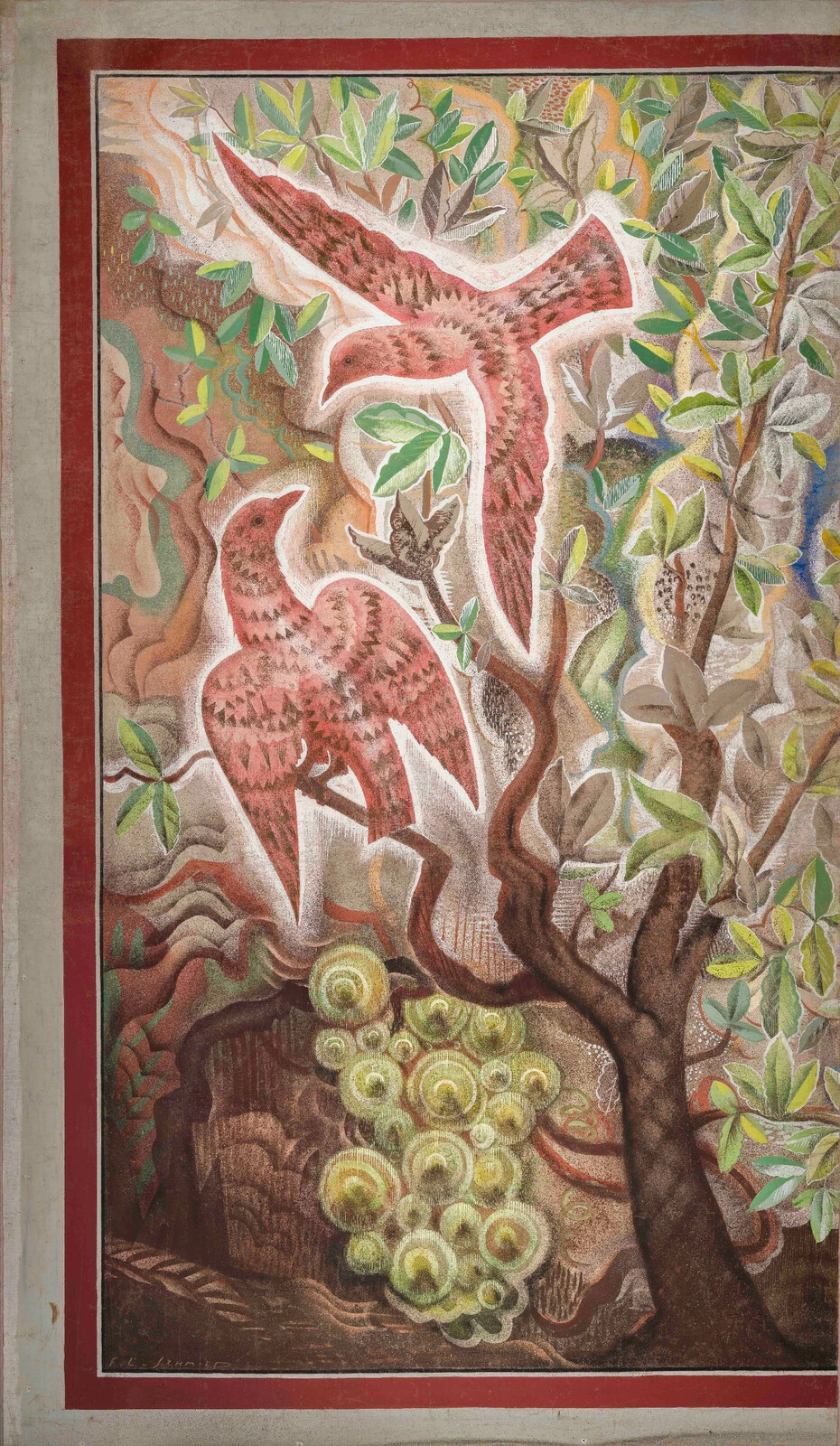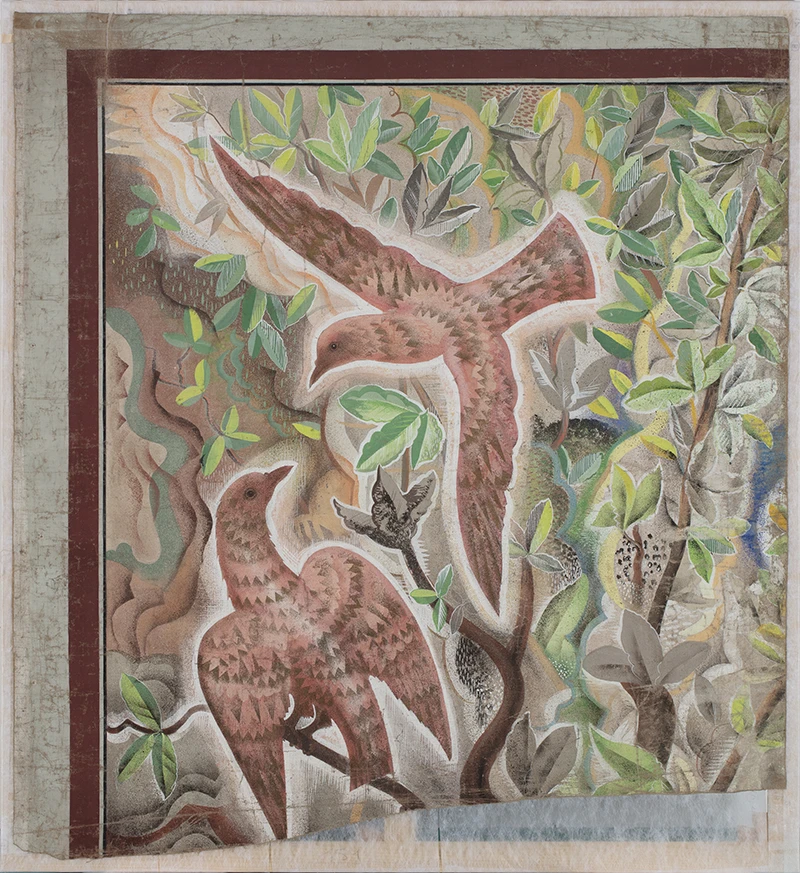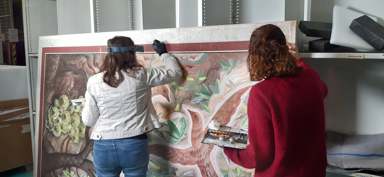 Choix d’une réintégration « visible » pour la peinture de François Louis Schmied Le Voyage imaginaire – L’arrivée de la caravelle afin de respecter le caractère de cartons de tapisserie de l’œuvre - Retouche par Antonella Trovisi et Constanza Ceradini © Catherine Arnold 2023 ; photo après restauration © Corentin le Goff