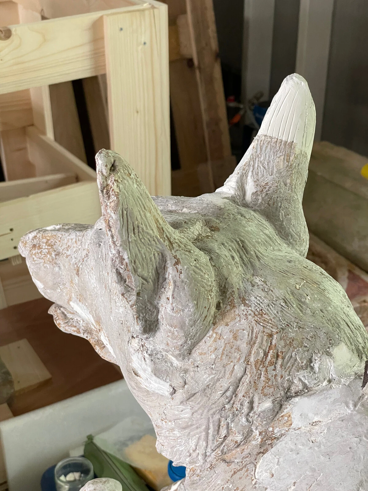 Dégagement d’un badigeon de propreté qui se desquame sur une sculpture d’Arthur Guéniot Maîtrise laissant réapparaître les détails du pelage du chien. © Julie Maure / Groupement Lucie Courtiade, 2022.