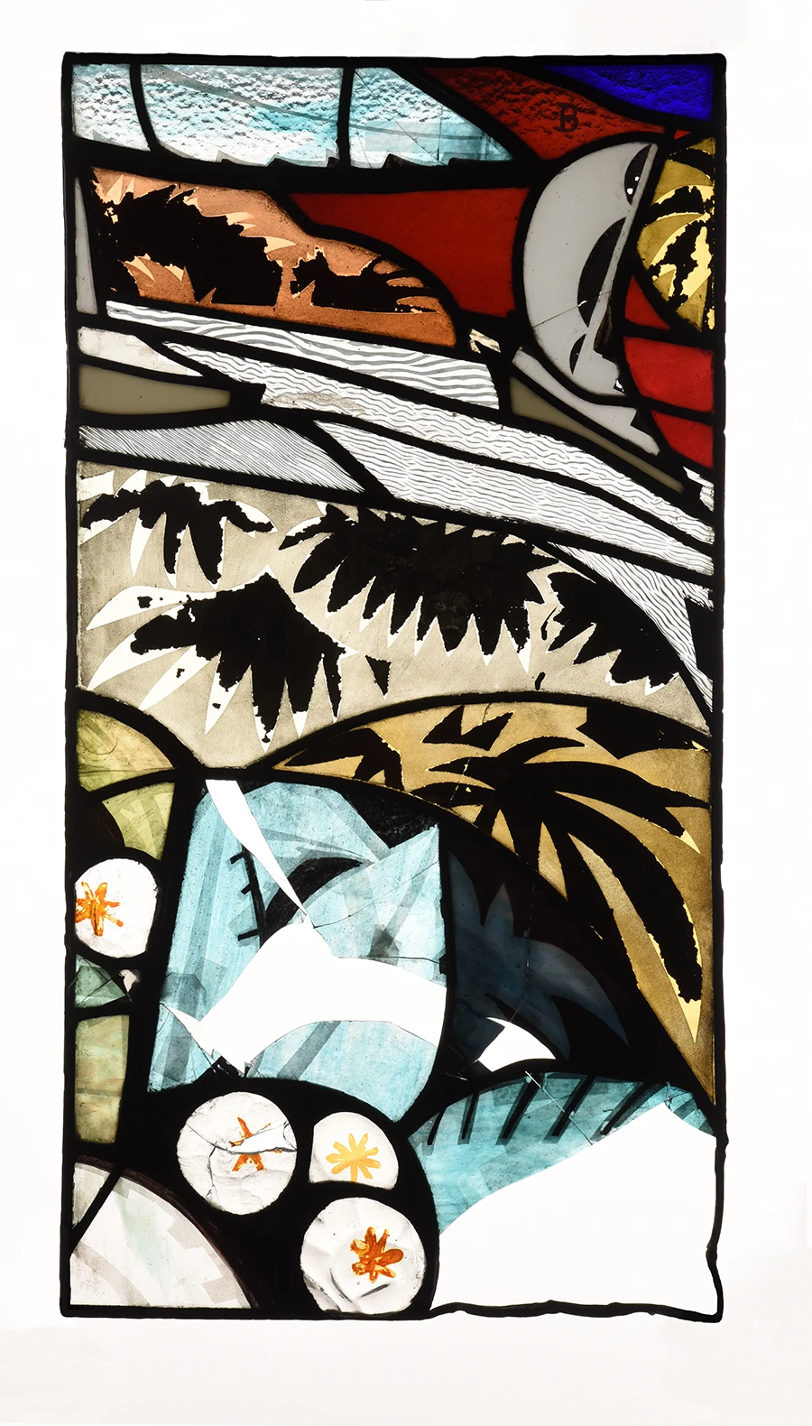 Restitution de morceaux de verres manquants sur un panneau du vitrail avec pose d’un tiffany délimitant le comblement peint et un ton légèrement différent © Benoît et Charlotte Marq © Catherine Arnold et photo après restauration © Corentin le Goff 2023