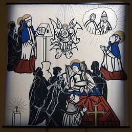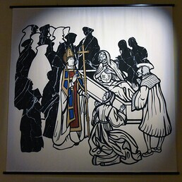 Tenu par un cahier des charges, le projet confié à l’artiste a été celui d’une revisite de la tenture de chœur de la basilique œuvre d’art religieux monumentale commandée durant le premier tiers du 16e siècle par Robert de Lenoncourt (abbé commendataire de Saint-Remi à partir de 1482, il devient archevêque de Reims en 1484).