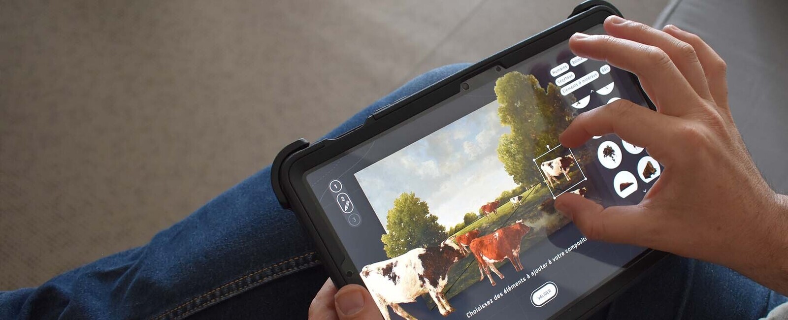Un ensemble de dix-neuf tablettes interactives, un vidéoprojecteur et un écran permet de réaliser des présentations virtuelles des collections en HD. Son usage interactif entre un-e médiateur-trice et les participants offre la possibilité d’appréhender les œuvres à partir d’une thématique donnée. L’application du Musée nomade a été développée par l’agence Opixido et permet de réaliser ses présentations d’œuvres interactives - apports pédagogiques et jeux - à l’aide de contenus modifiables en fonction des thématiques exploitées. La première application réalisée dans son entier porte sur le thème du paysage.