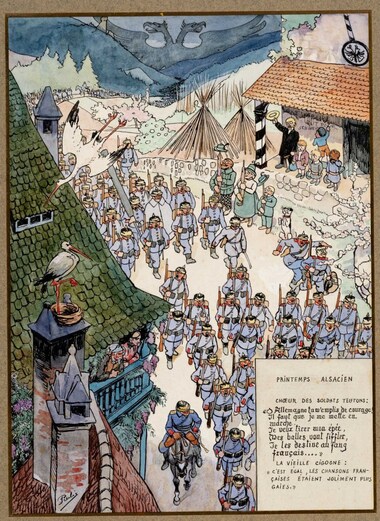 Pendant les quatre années de guerre, les propositions, aussi variées soient-elles stylistiquement, se focalisent sur l’ennemi allemand. Le guerrier boche, le kaiser Wilhem et son fils le Kronprinz sont les cibles préférées des caricaturistes comme Pierre Chatillon, Marcel Guillot ou Sem.
