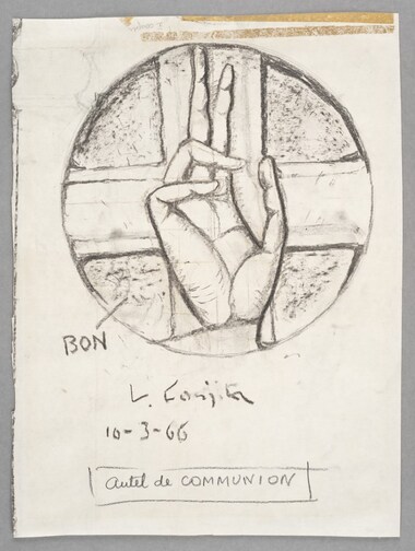 Détail du médaillon du fût de l’autel de la chapelle de la Communion de la chapelle Notre-Dame-de-la-Paix de Reims