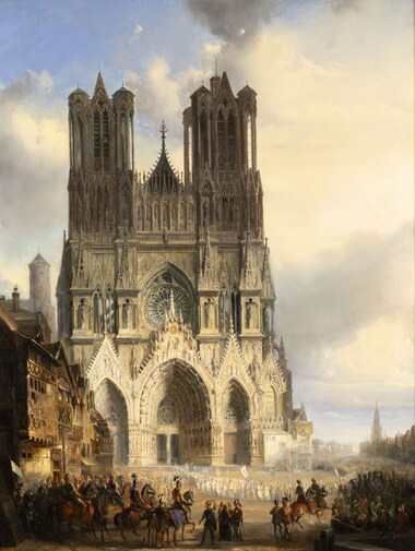 La Façade de la Cathédrale de Reims avec une procession médiévale et un cortège au premier plan