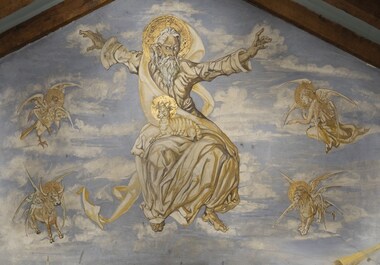 Au fond de la nef, trois scènes : en haut, Dieu le Père en Majesté, l’agneau sur ses genoux et entouré des quatre animaux symbolisant les évangélistes ; Sainte Elisabeth (montant de gauche) et la Vierge (montant de droite) ; au fond, Notre-Dame-de-la-Paix bénit et protège deux groupes de femmes et d’enfants. Foujita y représente sa femme à genoux (2ème personnage en commençant par la droite).