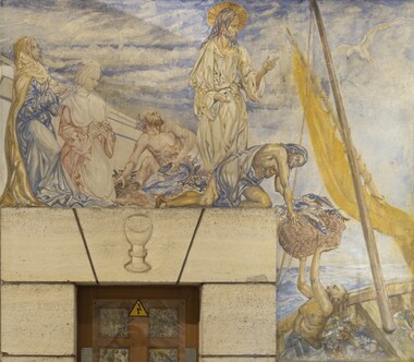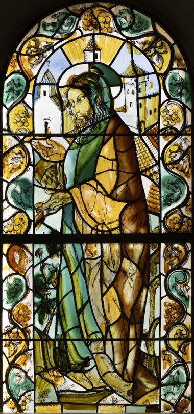 On accède par des marches à la chapelle consacrée à Notre-Dame-des-Vendanges, peinte sur le mur de droite, devant un paysage où se dressent la cathédrale de Reims et la basilique Saint-Remi. Face à cette scène, les sept péchés capitaux. Les panneaux du vitrail illustrent la Création, la Chute de l’Homme et l’Arche de Noé.