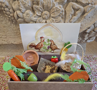 Une poule se cache dans les sculptures et un lapin se dissimule sur des carreaux de pavement : retrouve-les ! Puis écoute les tintements des cloches qui annoncent une chasse aux œufs dans le cloître.