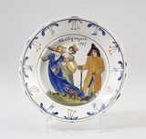 Assiette ronde, assise plate, bord chantourné, au décor polychrome (jaune, bleu, vert, noir, marron) figurant au centre une scène satirique représentant un couple de femmes de dos, l’une couronnée, la poitrine dénudée, l’autre portant un bonnet, la robe déchirée au postérieur ; derrières-elles, une homme coiffé d’un tricorne, vêtu d’une redingote, tenant une canne et un chien en laisse.