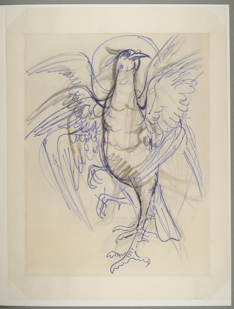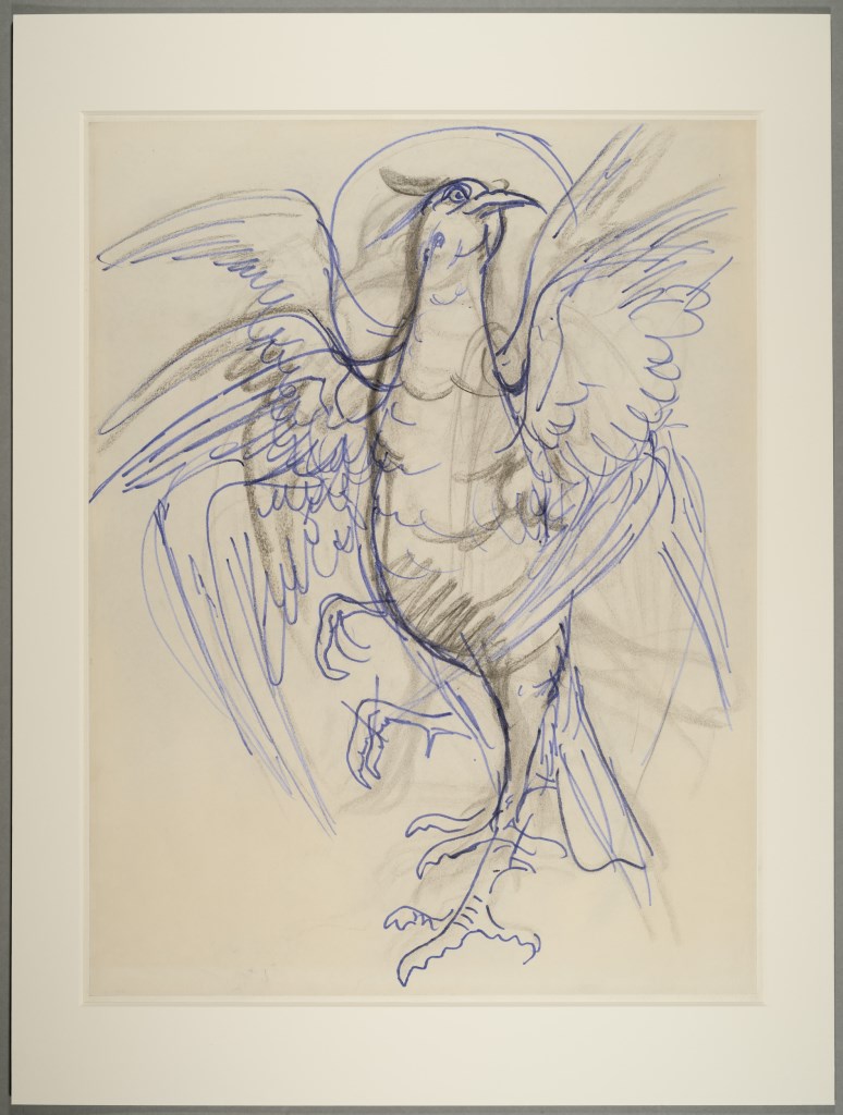Oiseau auréolé, quasi de face, tête tournée, ailes éployées, sur une seule patte.
