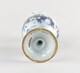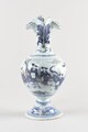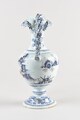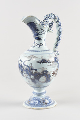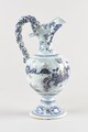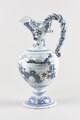 Aiguière sur piédouche orné d’une bague, panse ovoïde à léger épaulement, col élancé évasé enrichi de deux lobes accrochés sur la lèvre, verseur, deux terminaisons tronconiques torsadées de part et d’autre de l’anse torse également décorée de ponctuations bleues attachée en haut de panse, décor en camaïeu de bleus figurant des motifs floraux sur le pied, palme sur le col, sur la panse, scène historiée figurant quatre chinois sur fond de paysage, deux assis, deux en pied, vêtus de costumes traditionnels.