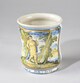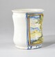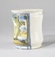 Albarello, assise annulaire, corps tubulaire, lèvre évasée, au décor polychrome figurant un homme barbu en marche entre deux arbres au bord de l’eau, bâtiments et collines au fond, oiseaux dans le ciel.