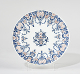 Assiette ronde, assise plate, au décor polychrome (rouge, bleu) constitué d’une corbeille fleurie à lambrequin au centre, décor de cartouches quadrillés à lambrequins et de guirlandes fleuries.