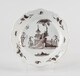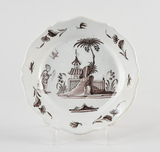 Assiette ronde, assise plate, bord chantourné, au décor manganèse, genre chinois, paysage avec personnage (femme), pagode, cocotier ; oiseaux, papillons et fleurs sur le marli.