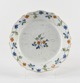 Assiette à assise plate, marli oblique, bord chantourné, lèvre arrondie, au décor polychrome consistant au centre en un plant floral, guirlande florale sur le marli.