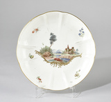 Assiette creuse, ronde, assise annulaire, bord chantourné avec arêtes en relief sur l’aile, au décor polychrome constitué au centre d’un paysage bordé d’un ornement doré représentant un chateau au bord d’un cours d’eau environné de montagnes, personnages épars ; fleurettes sur l’aile, liseré doré sur le pourtour.