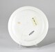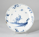 Assiette ronde, assise plate, au décor bleu-blanc figurant au centre une licorne, de profil droit, tête tournée, patte avant gauche levée, végétation, insectes en vol, tiges florales sur l’aile.