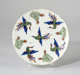 Assiette à fond blanc, décor polychrome (rouge, bleu, vert), d’oiseaux en vol et de branches fleuries stylisées