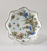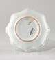 Petite jatte,assise annulaire, bords festonnés formant huit pétales, ornée au centre d’un décor couvrant à la corne de laquelle jaillissent des tiges florales, insectes ; frise sur le marli.