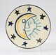 Assiette ronde, assise annulaire, au décor polychrome (bleu, vert, jaune) représentant une lune et un soleil anthropomorphes, étoiles sur l’aile.