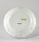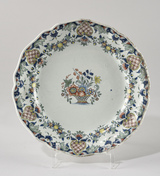 Assiette, assise plate, bord festonné, décor au centre d’un corbeille de fleurs ; sur le marli, décor consistant en une frise alternant agrafes à lambrequins et guirlandes florales.