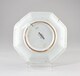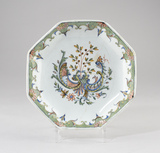 Assiette creuse octogonale, assise plate, au décor polychrome (vert, rouge, bleu, jaune) constitué au centre de deux oiseaux dans un nif fermé de cartouches rocailles d’où s’échappent des branches fleuries ; bordure quadrillée verte à fleurs et lambrequins.