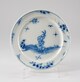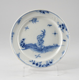 Assiette ronde, assise plate, au décor bleu-blanc figurant un personnage genre Callot au centre, bossu chapeauté, de profil droit, végétation, bâtiments au fond, insectes en vol, tiges florales et végétation sur l’aile.