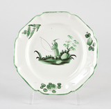 Assiette ronde à bord chantourné et assise plate constitué d’un décor polychrome vert et noir composé d’un homme chinois de profil, debout et pêchant à la ligne au centre du fond, de trois tiges florales sur l’aile et d’un liseré vert sur la lèvre.