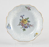 Assiette au bord chantourné, assise plate, au décor polychrome (bleu, violet, jaune, vert, rose, marron, blanc) composé en son centre d’un bouquet floral, sur le marli en alternance décor de fleur et de lambrequin blanc, le bord est souligné d’un liseré jaune.