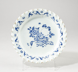 Assiette à assise annulaire, décor de camaïeu bleu se composant d’un personnage chinois en pied levant le doigt comme s’il indiquait une direction dans un paysage, le marli est surmonté d’un liseré double, en face externe, motifs végétaux rayonnant autour de l’assise.