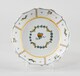 Assiette ronde, assise plate, bord chantourné, au décor polychrome (orange, jaune, vert, bleu) constitué au centre d’un papillon dans un cercle de fleurs de myosotis et branches ; marli alternant fruits et paillons séparés par des bandes.