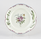 Assiette, assise plate, bord festonné, décor au centre, bouquet de fleurs ; sur le marli, fleurs en relief, pétale stylisée sous le liseré.