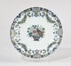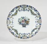 Assiette ronde, assise plate, à décor polychrome (rouge, bleu, jaune) constitué au centre d’un panier fleuri avec raisins et grenade, au marli, guirlandes de fleurs alternant avec des réserves quadrillées à lambrequin.