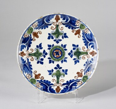 Assiette ronde, assise plate, décor polychrome (bleu, vert, rouge de fer), orné sur le marli de fleurons et rubans ; au centre, fleur et feuilles en rosace.