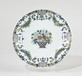 Assiette ronde, assise plate, à décor polychrome (rouge, bleu, jaune) constitué au centre d’un panier fleuri avec raisins et grenade, au marli, guirlandes de fleurs alternant avec des réserves quadrillées à lambrequin.