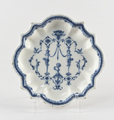 Assiette ronde, bord chantourné, assise plate, aile à côtes, au décor en camaïeu bleu à la Berain constitué de bustes féminins, rinceaux et fleurons, frise sur le pourtour.