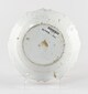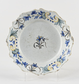 Assiette à assise plate, marli oblique, bord chantourné, lèvre arrondie, au décor polychrome consistant au centre en un plant floral, frise florale d’inspiration rocaille sur le marli composée de lambrequins, cuir et fleurs.