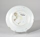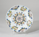 Assiette ronde, assise annulaire, décor polychrome (bleu, rouge, jaune, vert, manganèse), orné sur le marli d’une frise de trois fruits en bouton alternés de fleurons, au centre, rayonnement de fleurs en rosace.