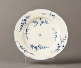 Assiette ronde, assise annulaire, bord chantourné, au décor en camaïeu bleu dit à la brindille constitué de tiges florales, liseré sur la lèvre.