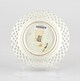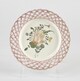 Assiette ronde, assise annulaire, bord dentelé, marli à jour au décor polychrome (rose, vert, jaune, bleu, noir) constitué d’un bouquet de fleurs au centre, croisillons rose sur le marli.