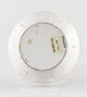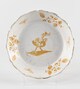 Assiette creuse, assise concave, paroi oblique, bord festonné, décor orangé consistant au centre en un oiseau fantastique genre chinois ; sur l’aile, alternance de feuilles de chêne et glands et de papillons.