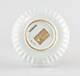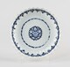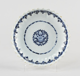 Assiette creuse à bord dentelé, assise annulaire, au décor bleu-blanc concentrique consistant au centre en une rosace en réserve au bord dentelé, cernée d’un rang d’oves et losanges apointés, sous le bord frise de lambrequins sous un filet plus clair.