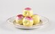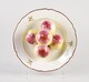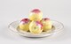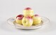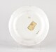 Assiette creuse, bord festonné, assise plate, trois guêpes sur le marli, liseré sur la lèvre, au centre, cinq pêches en ronde-bosse.