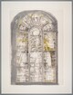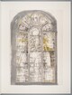 Baie composé d’un arc en plein cintre au centre accolé de deux baies rectangulaires et surmonté de cinq ouvertures en forme de pétale. Effets de lumière et de perspective rendus par un quadrillage sur fonds gris parsemé de touches jaunes et rouges.