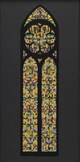 Baie en arc brisé composé de deux lancettes en arc brisé surmontée d’une rosace polylobée, aux motifs de damier multicolore et répétitif à dominante jaune.