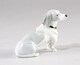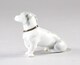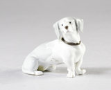 Basset assis, de robe blanche et grise, portant autour du cou un collier brun.