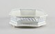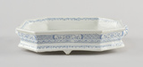 Bassin octogonal sur pied, deux anses horizontales torsadées, au décor en bleu dit à la Bérain constitué de motifs floraux stylisés où s’alternent en son centre coquilles, fontaine et lambrequins formant cartouche, sur le pourtour s’alterne frise à motifs géométriques et cartouche à motifs floral, frise à motifs géométriques, frise à fleurons stylisés.