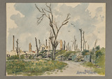 A proximité de bâtiments détruits et d’arbres mutilés, talus où sont aménagés des positions de tir pour canon de 120 français.